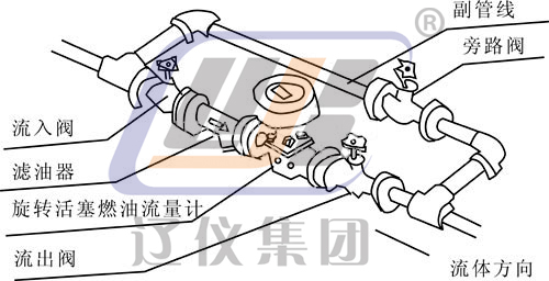 該流量計必須與濾油器配套使用而用水平安裝(即表盤在水平位置),安裝時要注意流體流向,應符合流量計主體上的箭頭所示方向。為了使工藝設備不停止運轉(zhuǎn)即可檢修流量計與清洗濾油器,應裝設副管線,可參照下面的安裝示意圖。